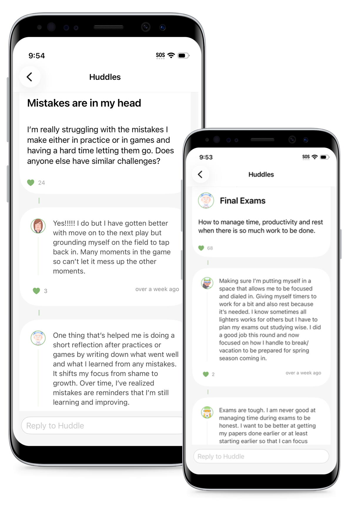 High school students don’t participate in NDUR’s open, anonymous community conversations; instead, they use only private, school‑approved and moderated team and group spaces designed for their age and developmental needs. Best-in-class safeguards and 24/7 moderation ensure safety. They can, however, read the conversations shared by college athletes, giving them a safe, one‑directional window into how older peers talk about stress, balance, friendships, injuries, and performance pressure. This helps younger athletes feel less alone, learn healthy coping strategies, and build early awareness of mental wellness — all without posting or sharing any personal information. The result is a safe, age‑appropriate, and guided experience that supports learning and reflection while maintaining strong boundaries and privacy protections.